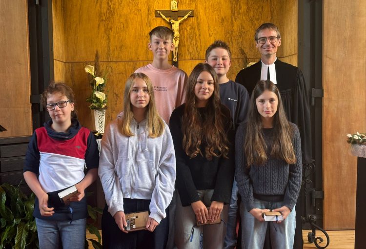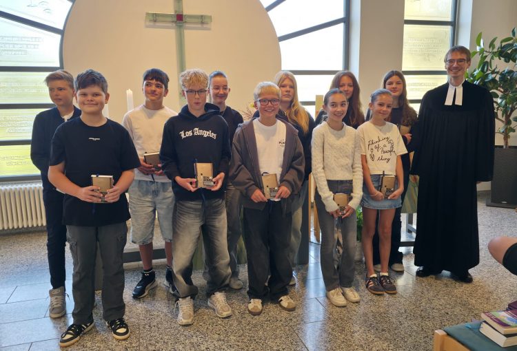 In Anschluss an die Predigt wurden alle Konfirmandinnen und Konfirmanden namentlich vorgestellt und alle erhielten eine spezielle Konfirmanden-Bibel „Hoffnung für alle – YOUBE“. Ein erstes Gruppenfoto rundete den Gottesdienst ab.